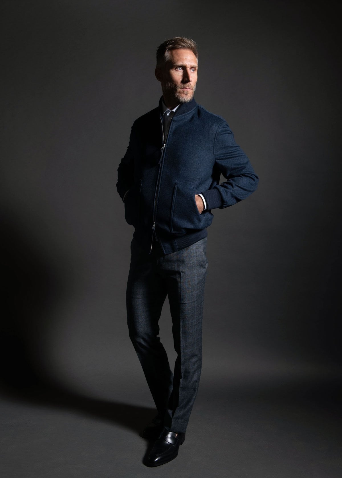 Our favorite custom bomber jacket this season. Hand-crafted in the finest wide herringbone - it's both iconic and a stand out piece all-in-one. We intentionally paired the jacket with a white shirt and grey trousers to keep the focus on this once in a lifetime bomber jacket.