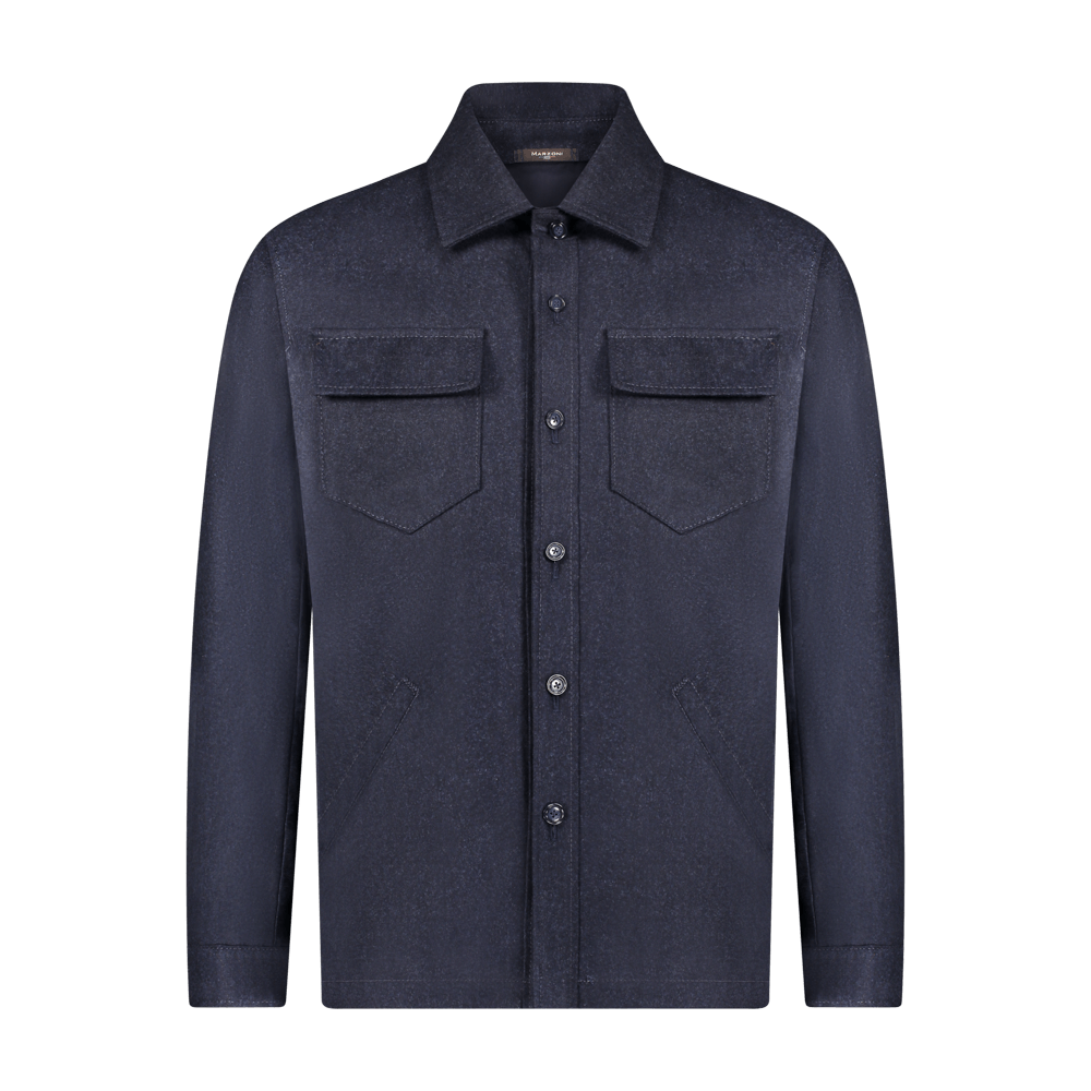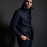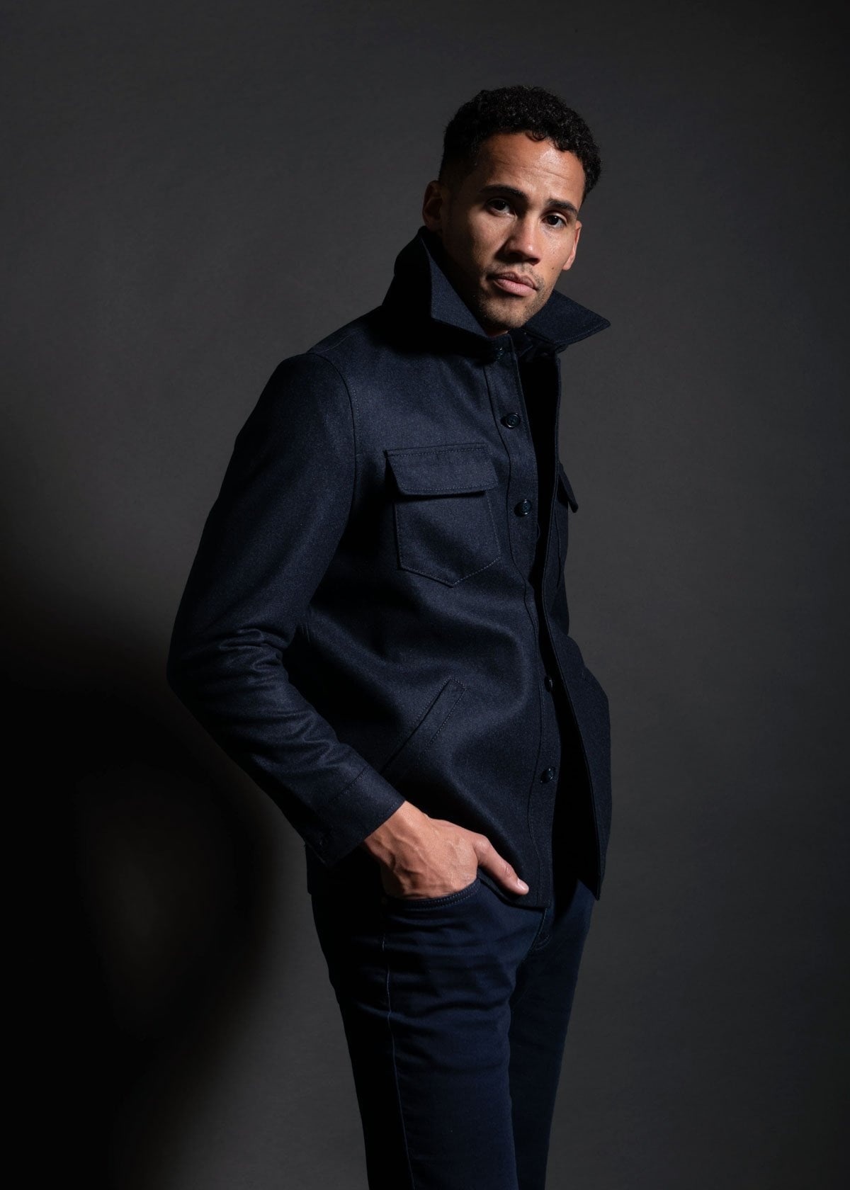 A great trick to always looking put together - stick to one color.  head-to-toe navy in custom fitting clothing will look striking; always. The wool/cashmere fresh take on a shirt jacket pairs perfectly with dark raw denim.
