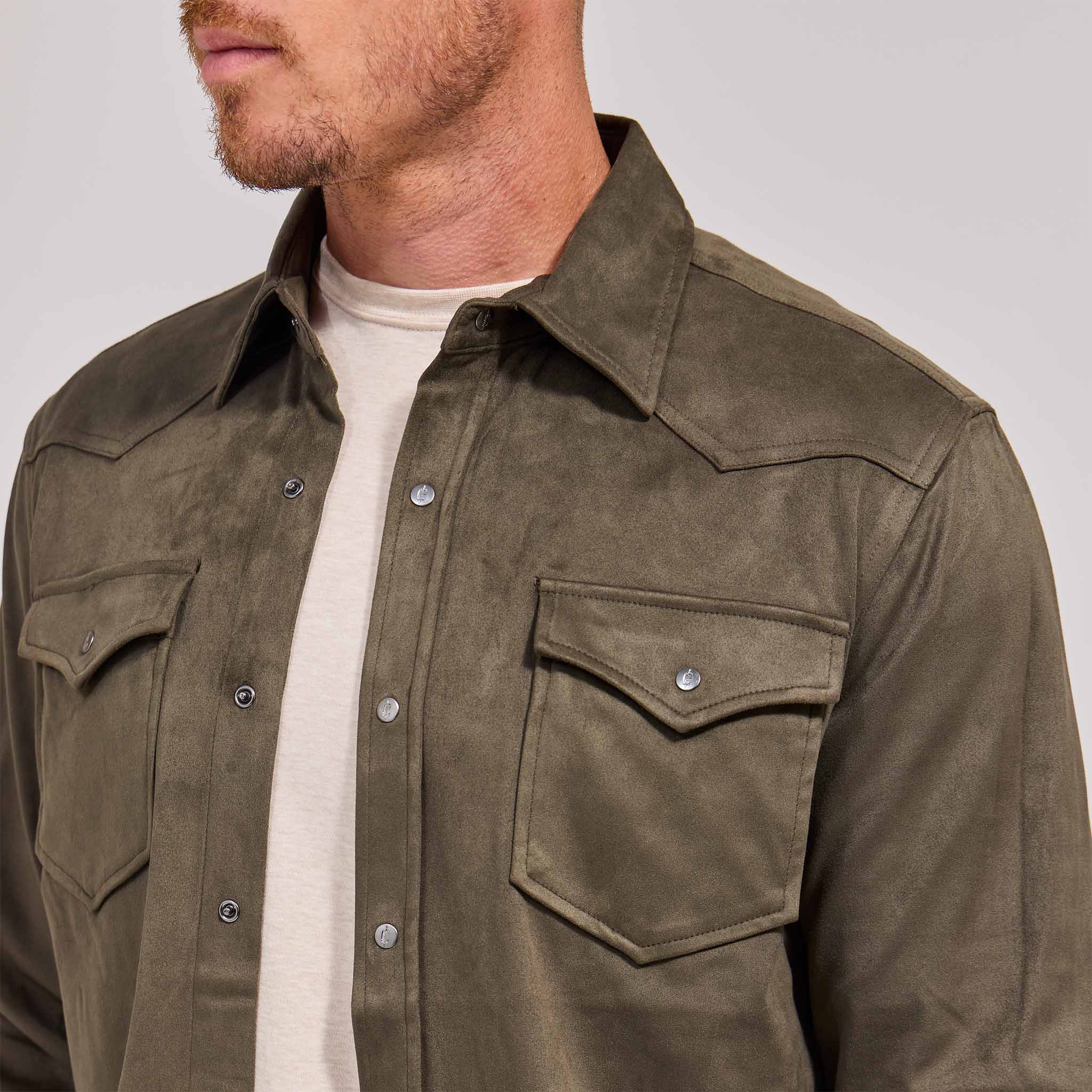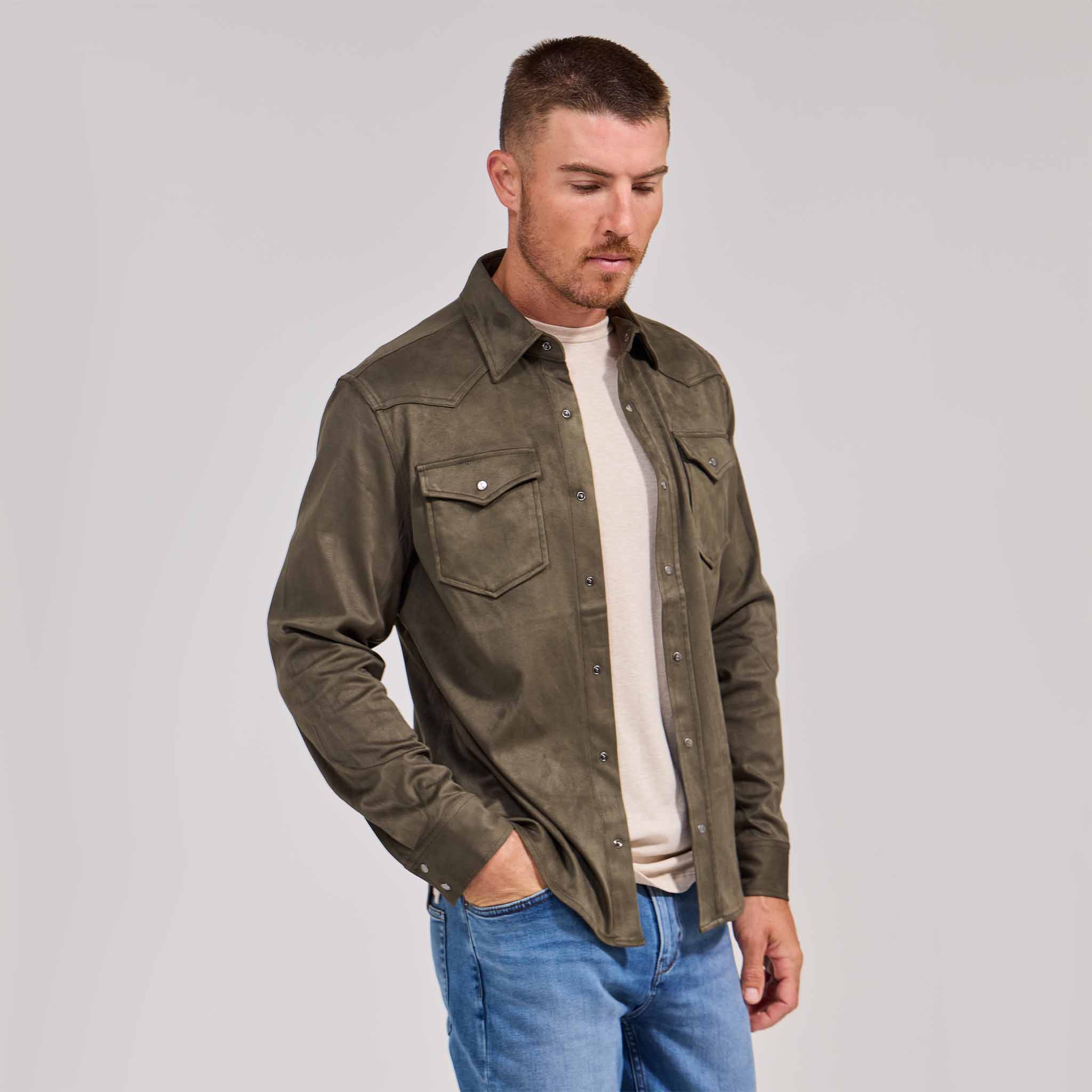 Now in a lighter weight. This overshirt perfectly demonstrates our "Fabric First" design ethos. Made from a featherweight buttery-soft microsuede, it has a classic collar shape with subtle western styling. The Wyatt Lite features a tailored fit that allows for Spring layering.